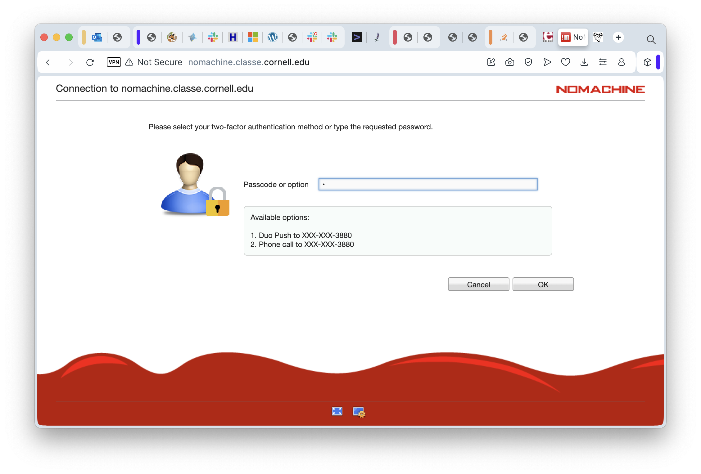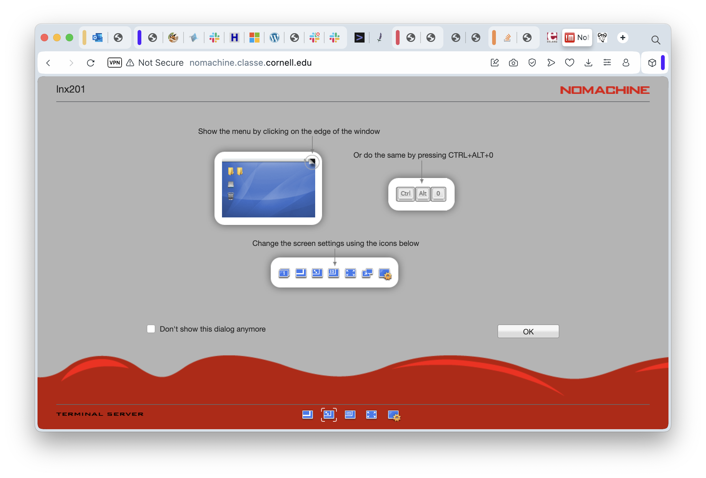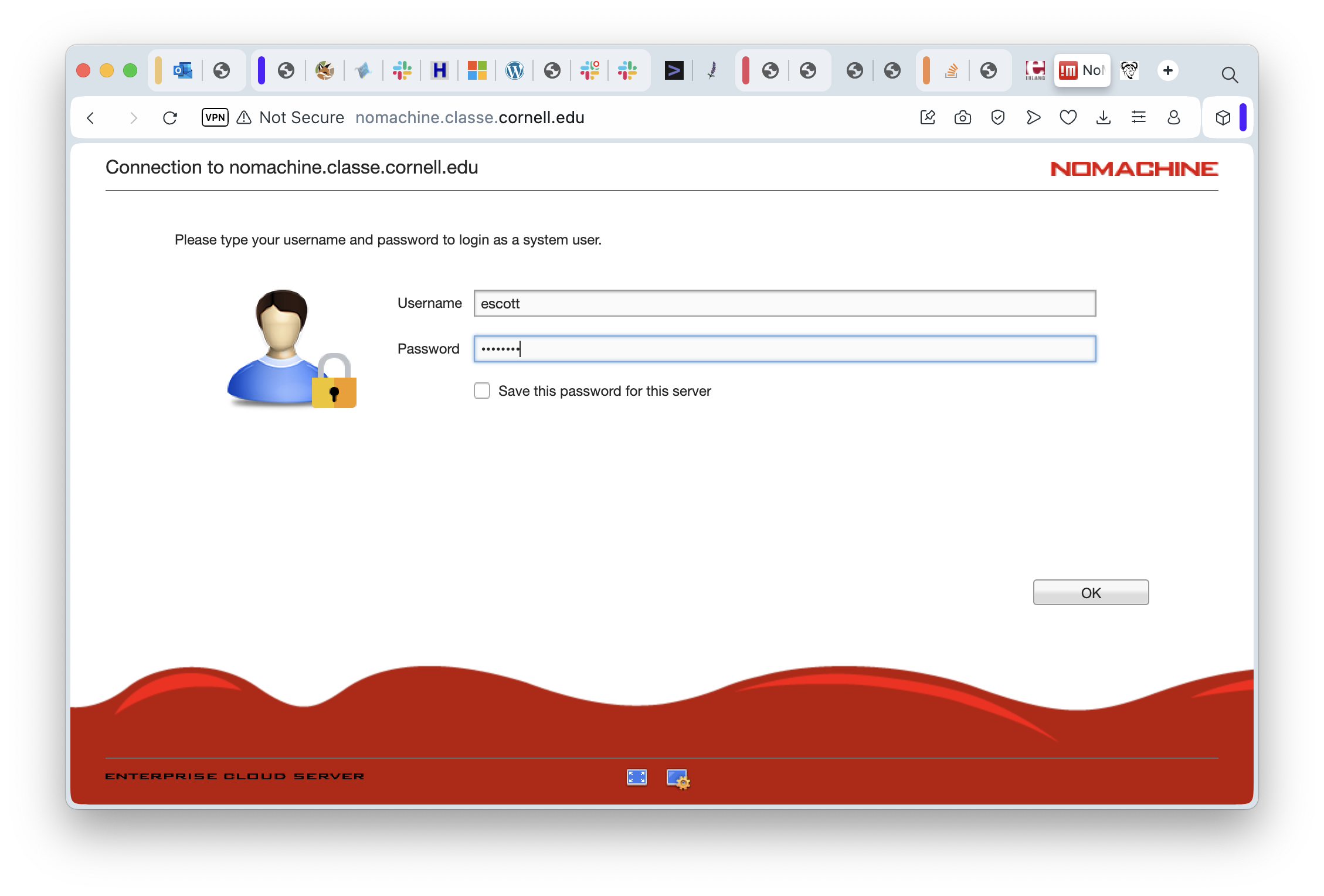 Go ahead and connect to the CLASSE internal network through the Pritunl VPN software. Then go to your web browser and put in the destination URL https://nomachine.classe.cornell.edu. In just a moment, you should be seeing the initial login screen for NoMachine itself. Put in your username and password, then click on “OK” in the lower right corner.
